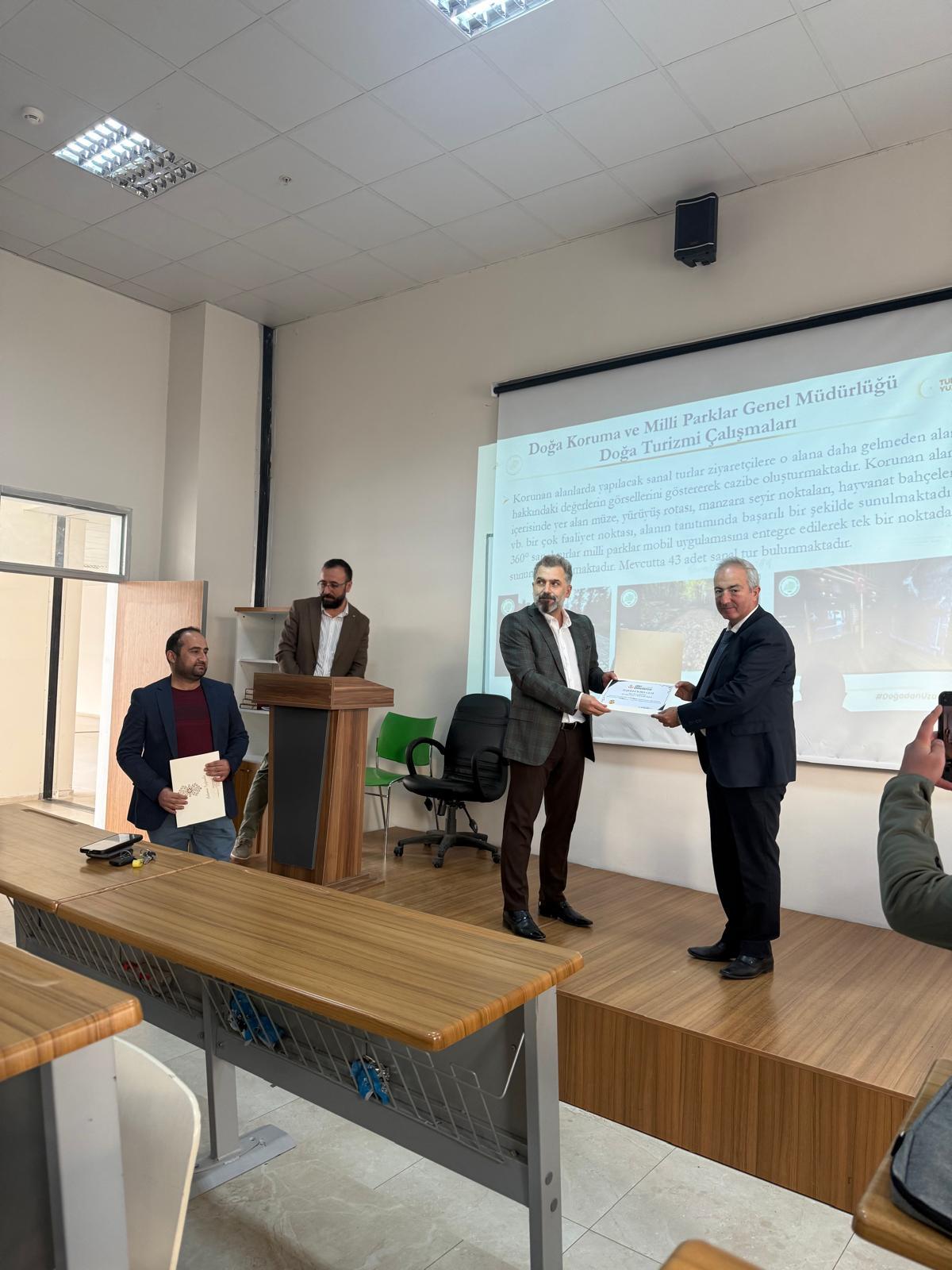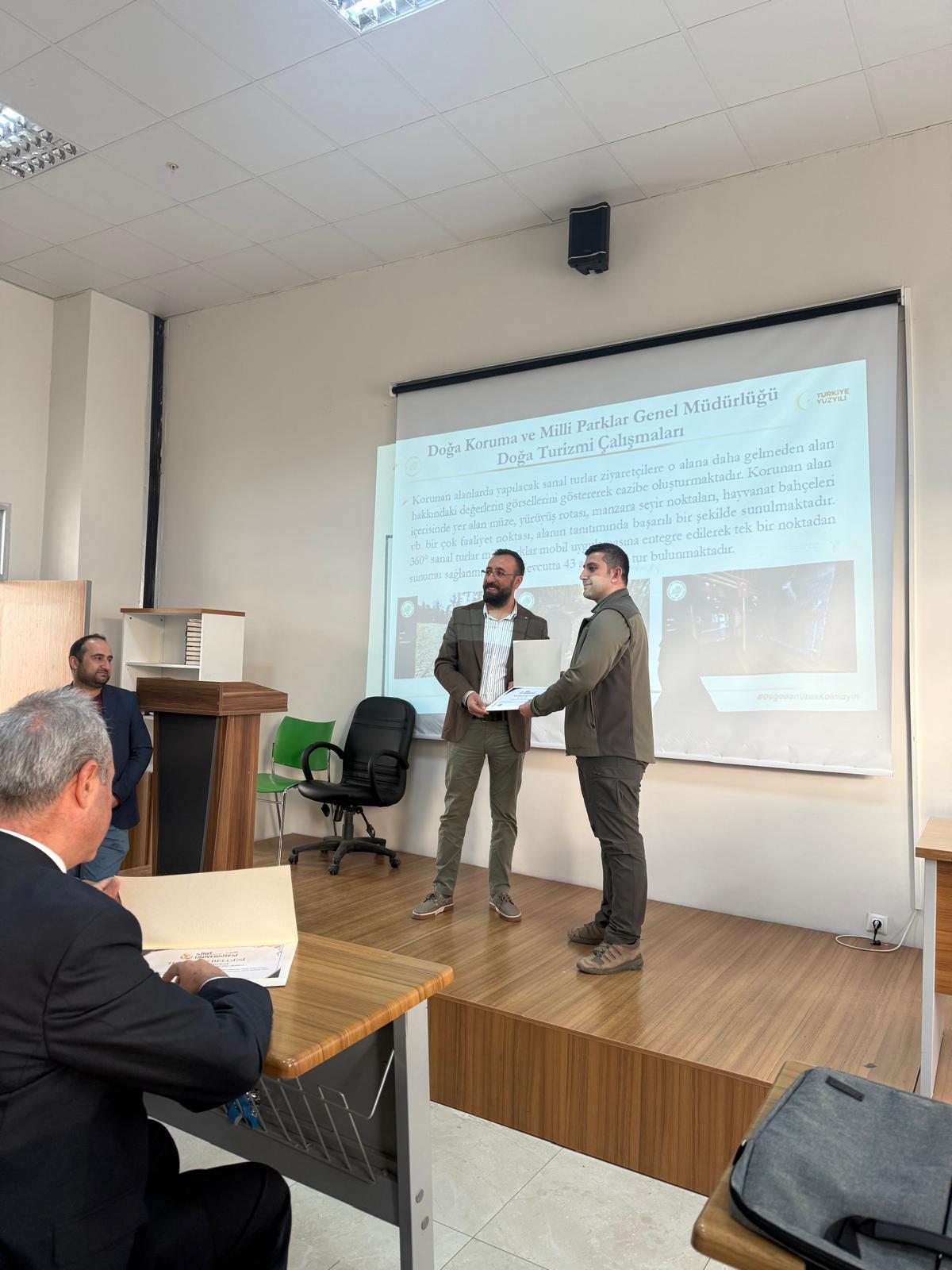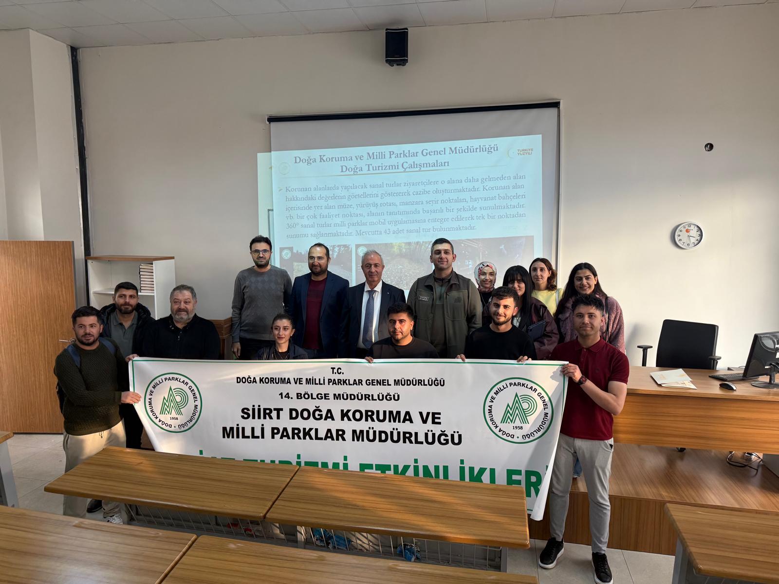 Siirt Doğa Koruma ve Milli Parklar Müdürü Sayın Nevzat AMCALAR ve Siirt Doğa Koruma ve Milli Parklar Merkez Şefi Gökhan Şeker tarafından Yüksekokulumuzda "Doğa Turizmi Eylem Planları Oluşturulması ve Sürdürülebilir Turizm Konulu" söyleşi gerçekleşmiştir. Söyleşiye katkıları için katılımcılara teşekkür belgeleri takdim edilmiştir.
